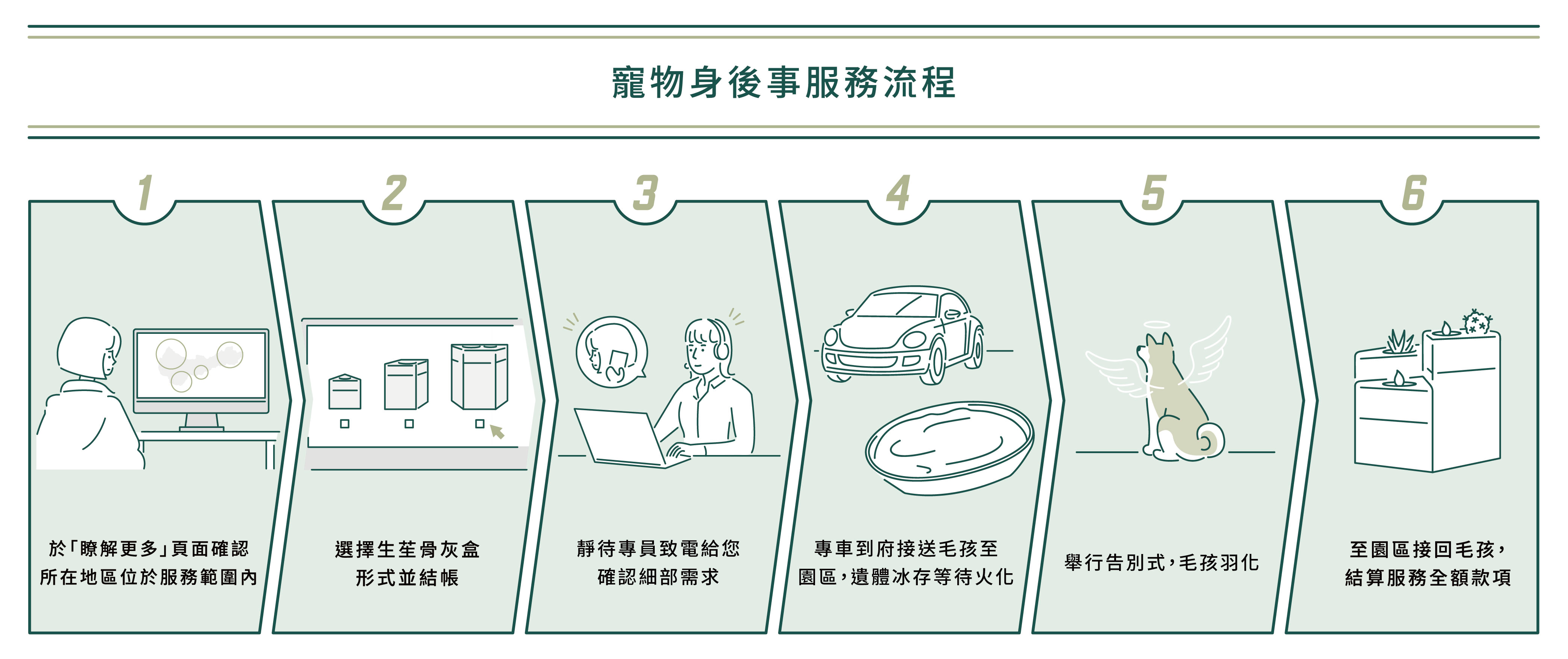 生苼配合北中南專業寵物禮儀業者,提供完善的寵物身後服務 ( 服務流程請見下圖 ) ,從專車接體、告別式、寵物火化到置入生苼植葬骨灰盒,為您減少繁複流程,並以人們亦舒心的方式成全毛孩回家的願望。
